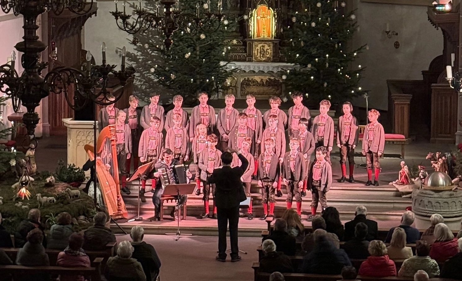 Unter der souveränen Leitung von Gerhard Jacobs präsentierte der Tölzer Knabenchor ein facettenreiches Programm mit Weihnachtsliedern aus aller Welt, ergänzt durch traditionelle Weisen aus Deutschland und dem Alpenland. Nach einer kurzen Pause leitete eine stimmungsvolle musikalische Einstimmung mit Harfe und Akkordeon den Übergang zum bayerischen Liedgut ein, das auch optisch unterstrichen wurde: Die jungen Sänger traten nun in ihren traditionellen Lederhosen auf. Die klaren und reinen Stimmen des Chores füllten den Kirchenraum mit einer besonderen Wärme und Klangfülle.